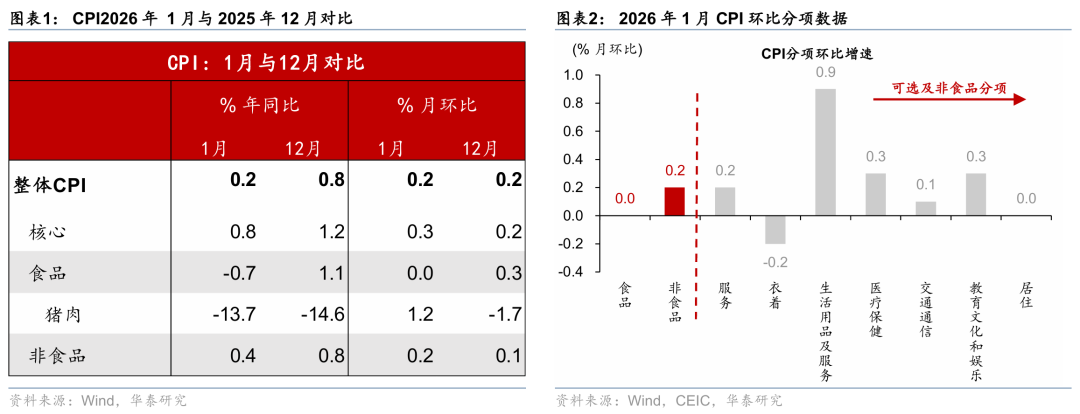 核心观点 ]article_adlist-->2026年1月中国CPI同比0.2%(前值0.8%,彭博一致预期0.4%),环比增速持平于12月的0.2%;PPI同比-1.4%(前值-1.9%),略高于彭博一致预期的-1.5%,环比较12月的0.2%上行至0.4%。