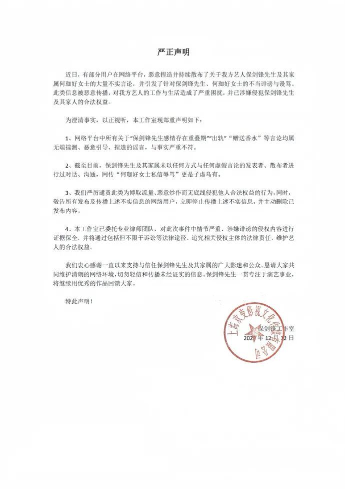 此前,12月12日,演员保剑锋工作室发布严正声明: